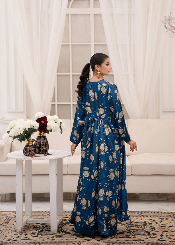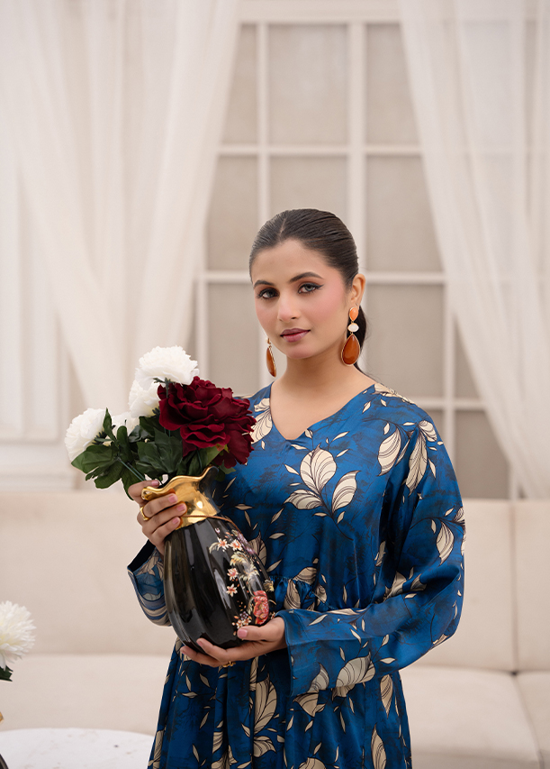 Add a touch of effortless grace to your wardrobe with this silk printed long shirt paired with a plain trouser. Crafted from smooth, lightweight silk, the fabric has a soft sheen and a fluid fall that moves beautifully. The rich teal base is highlighted with delicate leaf motifs, creating a refined yet easygoing look. Designed with a relaxed, flowy silhouette, this outfit offers comfort without losing its elegance. The plain trouser balances the print perfectly, making it suitable for everyday wear, casual outings, and polished daytime looks.